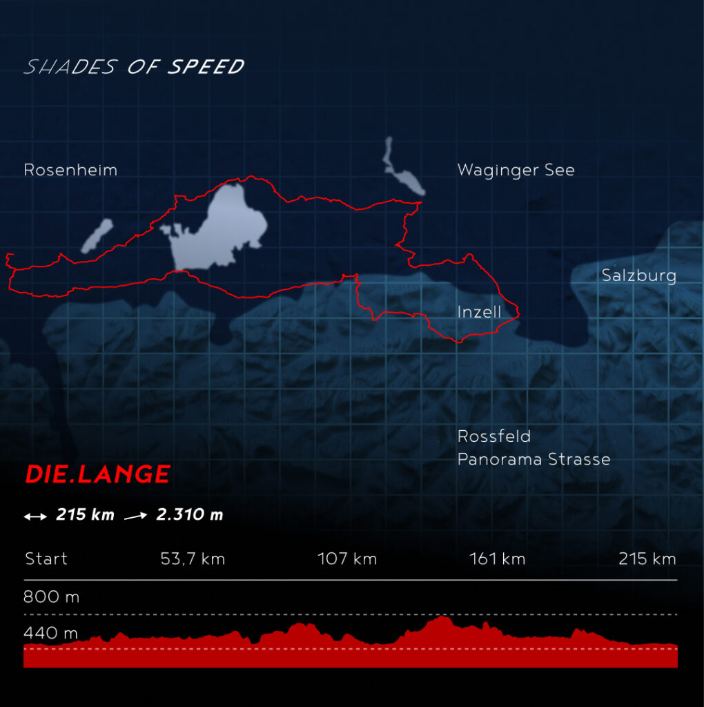 DIE.LANGE führt auf 215 Km und 2.300 Hm über den Simssee zur Eggstätter Hemhofer Seenplatte und anschließend zur ersten Verpflegungsstation in Oberbrunn. Idyllische kleine Straßen führen weiter in östlicher Richtung nach Waging, zur zweiten Verpflegungsstation. Von hier radelt ihr nach Bad Reichenhall, das beeindruckende, schroffe Felspanorama der Chiemgauer und Salzburger Alpenkette immer vor Augen. Frisch gestärkt geht es weiter zur nächsten Labestation bei den Adelholzener Wasserwelten, unserer Party-Station mit Live DJ. Entlang der Voralpen geht es in westlicher Richtung zur letzten Station in Bernau, ehe ihr die letzten Kilometer nach Kolbermoor in Angriff nehmt.